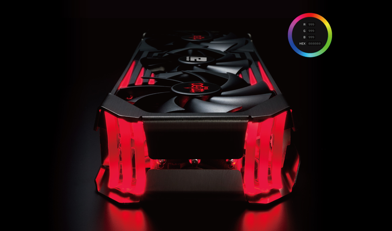 アドレサブルRGB LEDを備え、対応マザーボードと付属のARGB LEDケーブルを接続することで、同期が可能です。金属製バックプレートには「Red Devil」シリーズのトレードマークがデザインされており、ライティングにより鮮やかに照らし出されます。