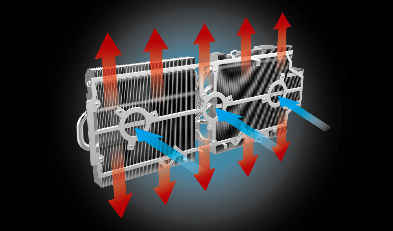 GPUやVRMが発する熱を受け取る銅製の受熱ベースと、6mm径×6の銅製ヒートパイプを装備しており、ヒートシンクへの熱の拡散効率が向上。また、アルミニウムフィンの増加により、熱の拡散を高めます。