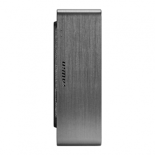 フォームファクターはMini-ITXで幅84mm×高さ244mm×奥行217mmのコンパクト設計。縦置き、横置き、どちらにも対応します。チタニウムグレーの4mm厚アルミニウムを採用した外装は、ヘアライン加工によりクールな質感を演出しつつも、丸みを帯びたカーブラインが柔らかな印象を与える、絶妙なバランスで仕上がっています。