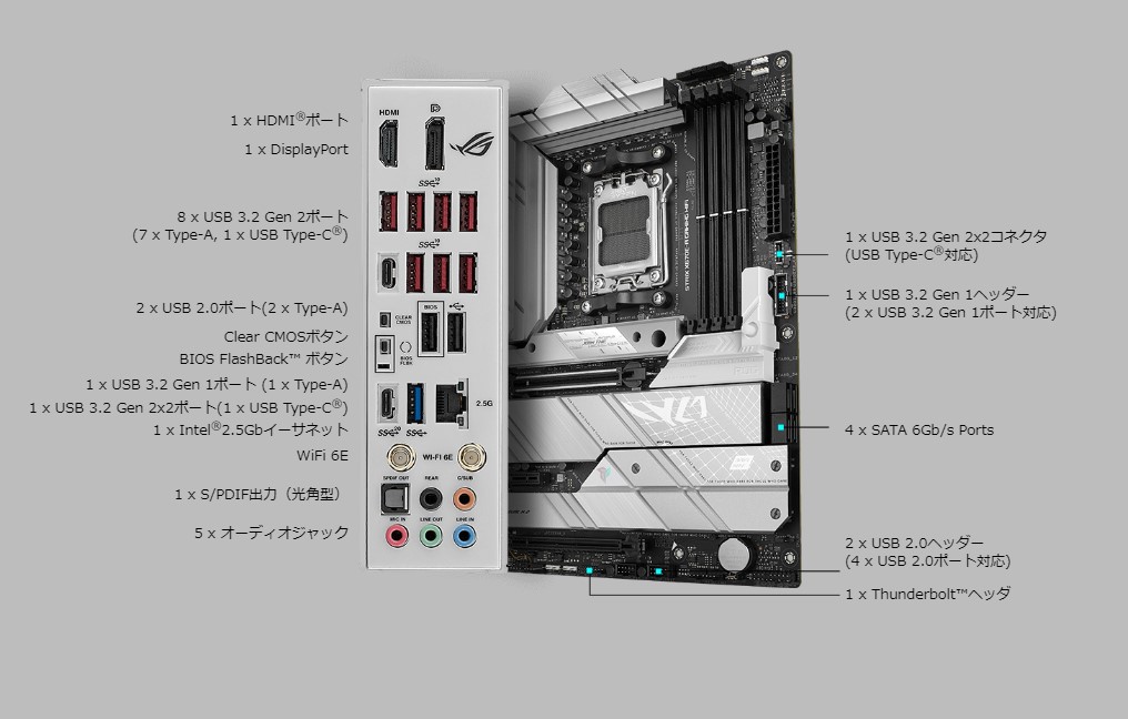 DDR5-6400+(OC)のメモリースロットを備え、「AMD EXPOテクノロジー」をサポート。また、PCIe 5.0スロットやM.2 PCIe 5.0スロット、USB 3.2 Gen2x2 Type-Cポートを搭載しています。ネットワークはWi-Fi 6E・ 2.5Gb LANを搭載し、高速な通信環境を構築できます。