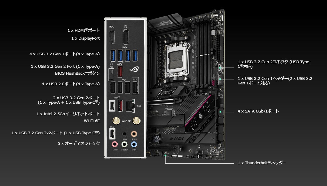 DDR5-6400+(OC)のメモリースロットを備え、「AMD EXPOテクノロジー」をサポート。また、PCIe 5.0スロットやPCIe 5.0 M.2スロット、USB 3.2 Gen2x2 Type-Cポートを搭載しています。ネットワークはWi-Fi 6E・ 2.5Gb LANを搭載し、高速な通信環境を構築できます。