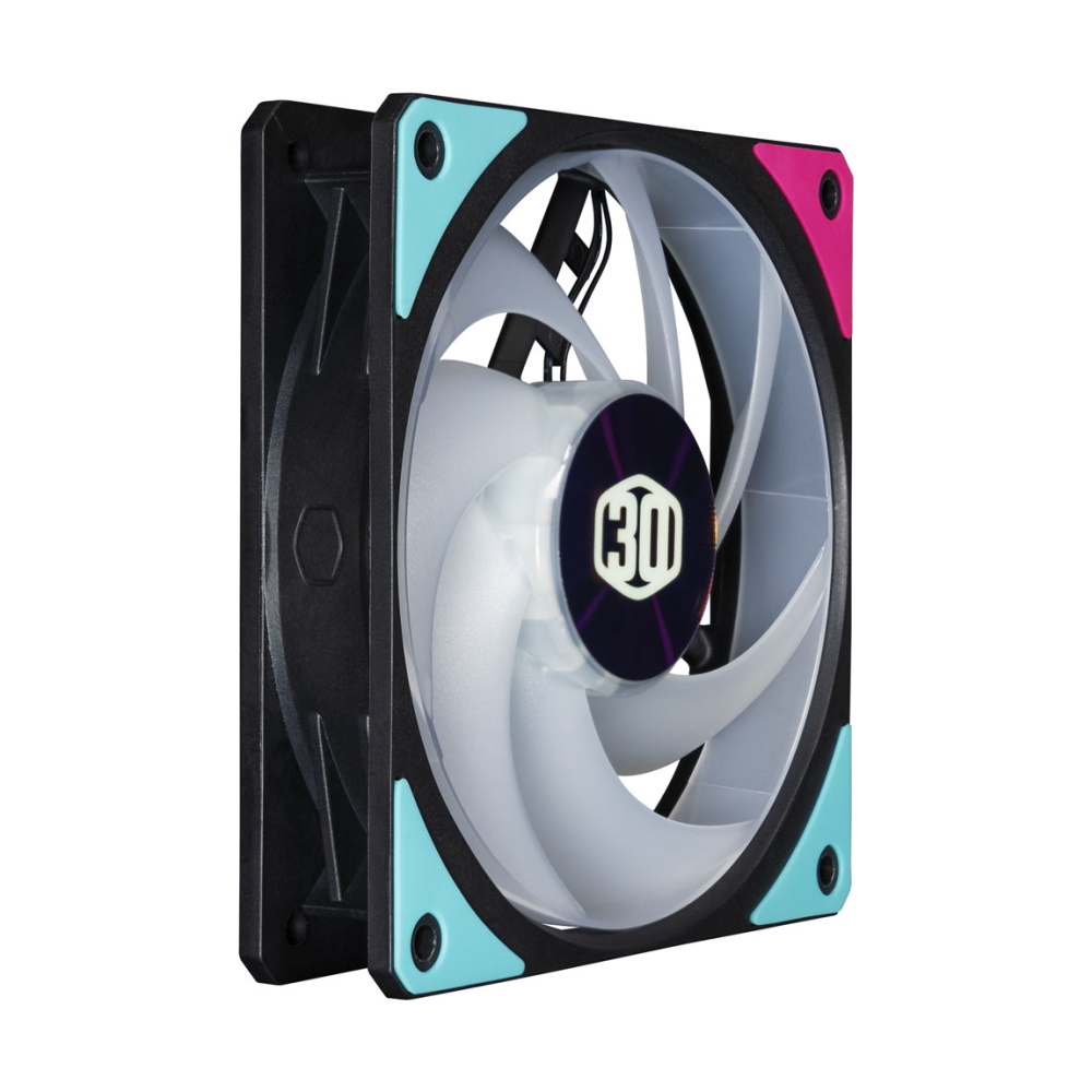 「Mobius 120P ARGB 30th Anniversary Edition」は、新しいリングブレードデザインを採用し、ファンブレードを相互に接続することで構造補強し、振動を抑えて安定性をさらに向上させています。軸受は厚いオイルコーティングと潤滑を利用した新しいループダイナミックベアリングを採用し、安定したパフォーマンスを可能にします。フレームに角度をつけ、サイドベントを面取りすることで、空気の流れを促進し、空気圧を最大化し、デッドエアを減少させます。特別なカラーリングを施した防振ダンパーにより振動を抑えています。アドレサブルGen2 RGBに対応し、Cooler MasterのMasterPlus+ソフトウェアおよび専用コントローラー(別売)と同期しカラー、効果、輝度などをカスタマイズすることが可能です。