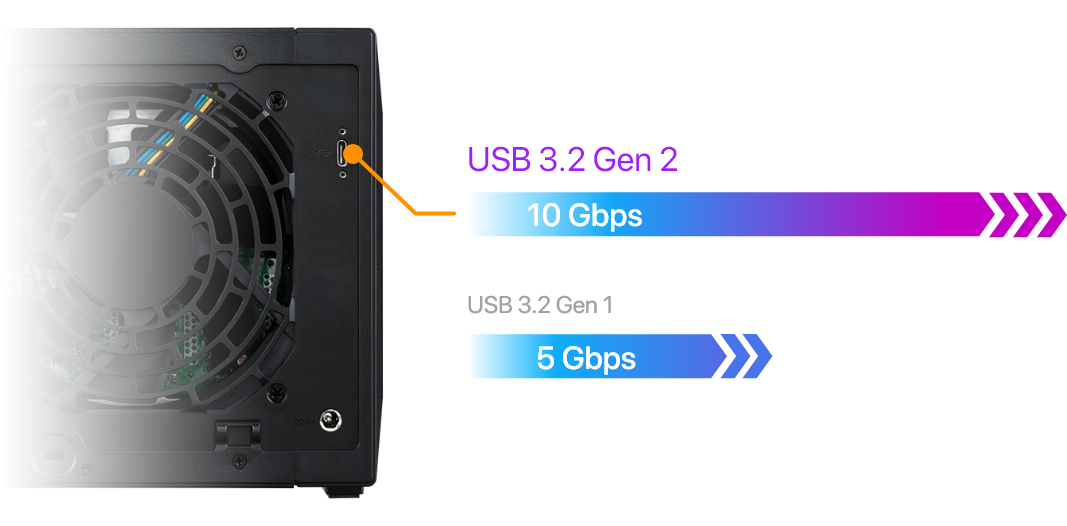 インターフェイスには、USB 3.2 Gen2 Type‐Cを採用しており、最大10Gbpsの転送速度にて、ファイルを高速に転送することができます。また、USB 3.2 Gen1をサポートするASUSTOR NASデバイスとの下位互換性も備えており、最大5Gbpsにて動作します。