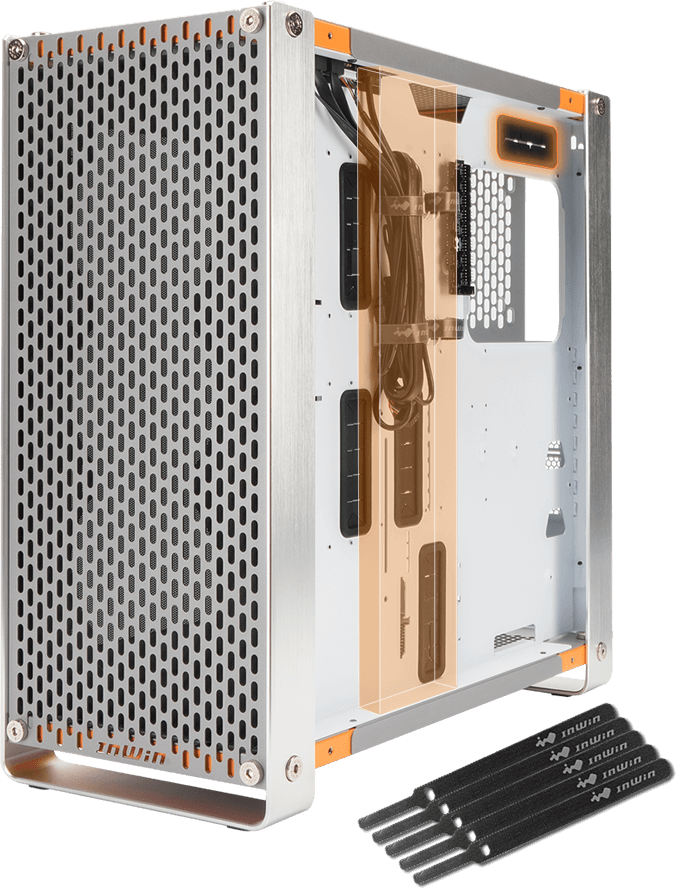 筐体は4mm厚のつや消しアルミニウムと1.2mmのスチールパネルにて構成。フレームのへりの部分には高級感のある光沢を生み出すダイヤカット加工を施したり、パネルを固定する四隅のネジには、自作の楽しさを共有するというコンセプト「iBuild, iShare」の文字「iBuild」をレーザー刻印するなど、InWinらしい職人気質と細部へのこだわりが溢れるデザインに仕上がっています。