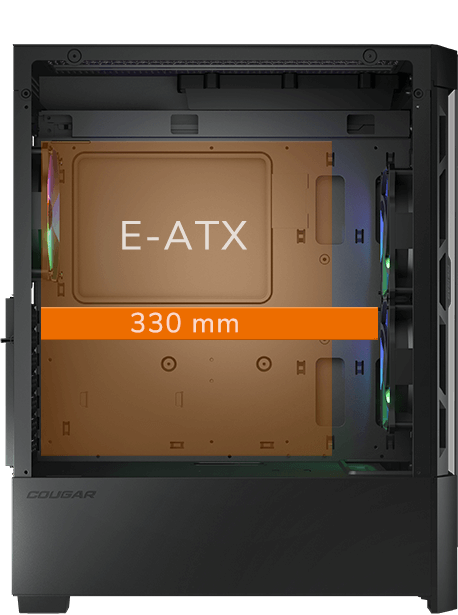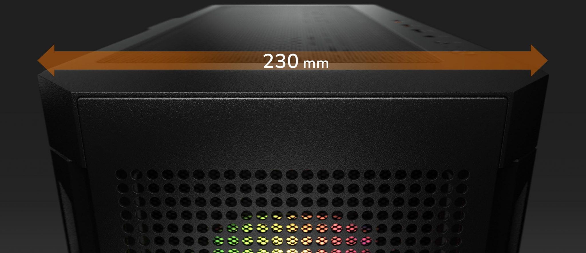 DUOFACE RGBは230mmのワイドボディ設計で余裕を持ったケーブルマネジメントスペースを確保しています。E-ATXマザーボード、330mmグラフィックカード、3.5インチHDDx2台、2.5インチSSDx2台を搭載可能な余裕を持った内部スペースで理想のシステムを構築することができます。