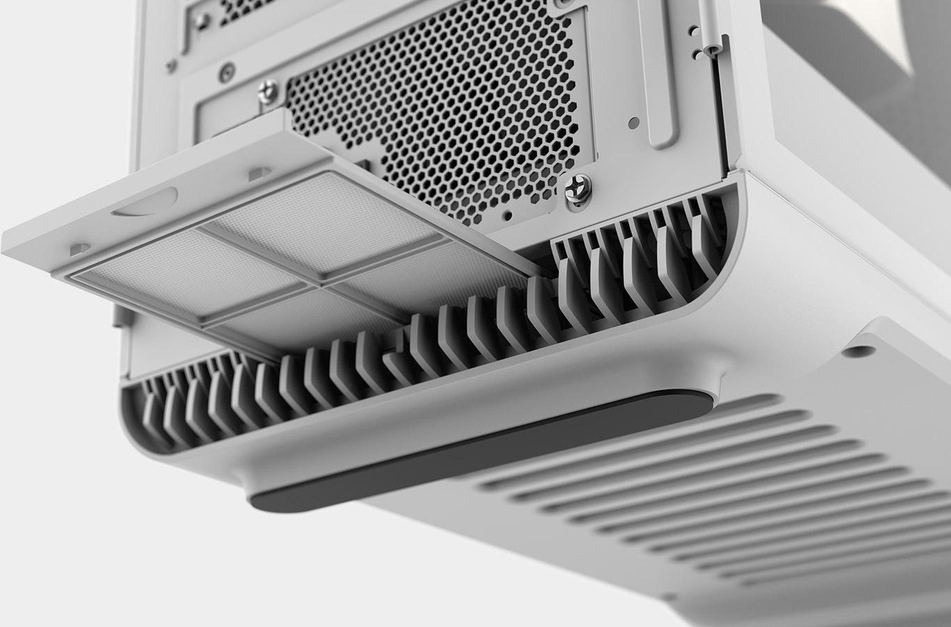 ボトムには電源用のダストフィルターを装備しています。後部からスライドして取り外せるので、メンテナンスも容易です。