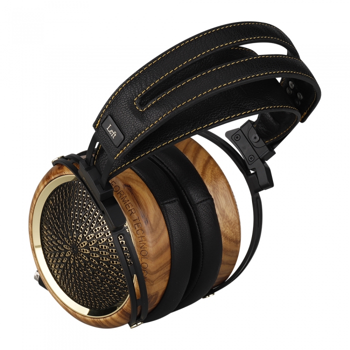 ヘッドホンハウジングにはブランドの代名詞となる木材加工技術を使用し、優れた音響特性と美しさを併せ持つ天然無垢材のゼブラウッドを採用。高品質なゼブラウッドの加工には、精密なCNC彫刻、研磨、塗装、自然乾燥などが含まれ、ラグジュアリーさを演出しています。ヘッドホンハウジングのスチールグリルは、名前の由来となる孔雀が尾を広げたようなデザインを採用し、ブラックとゴールドのはっきりとした層で互いを映し出します。これは装飾的なものだけではなく、各穴の特別な配置によって音響特性を調整する効果も持っています。ヘッドホンハウジングのゴールドパーツは全て24K金メッキが使用されています。優れた装着感を生み出すヘッドバンドとイヤーパッド