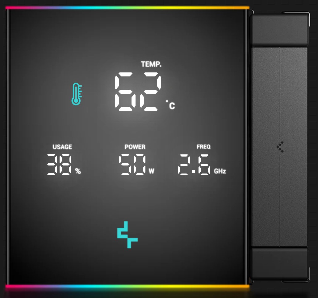 トップのデジタルパネルは、CPU温度だけでなく使用量やワット数もモニタリング可能になりました。表示情報は、マザーボードのUSB 2.0ヘッダーに接続することで、専用ソフトウェア上から制御することができます。パネル両端にはARGBストリップを備えています。