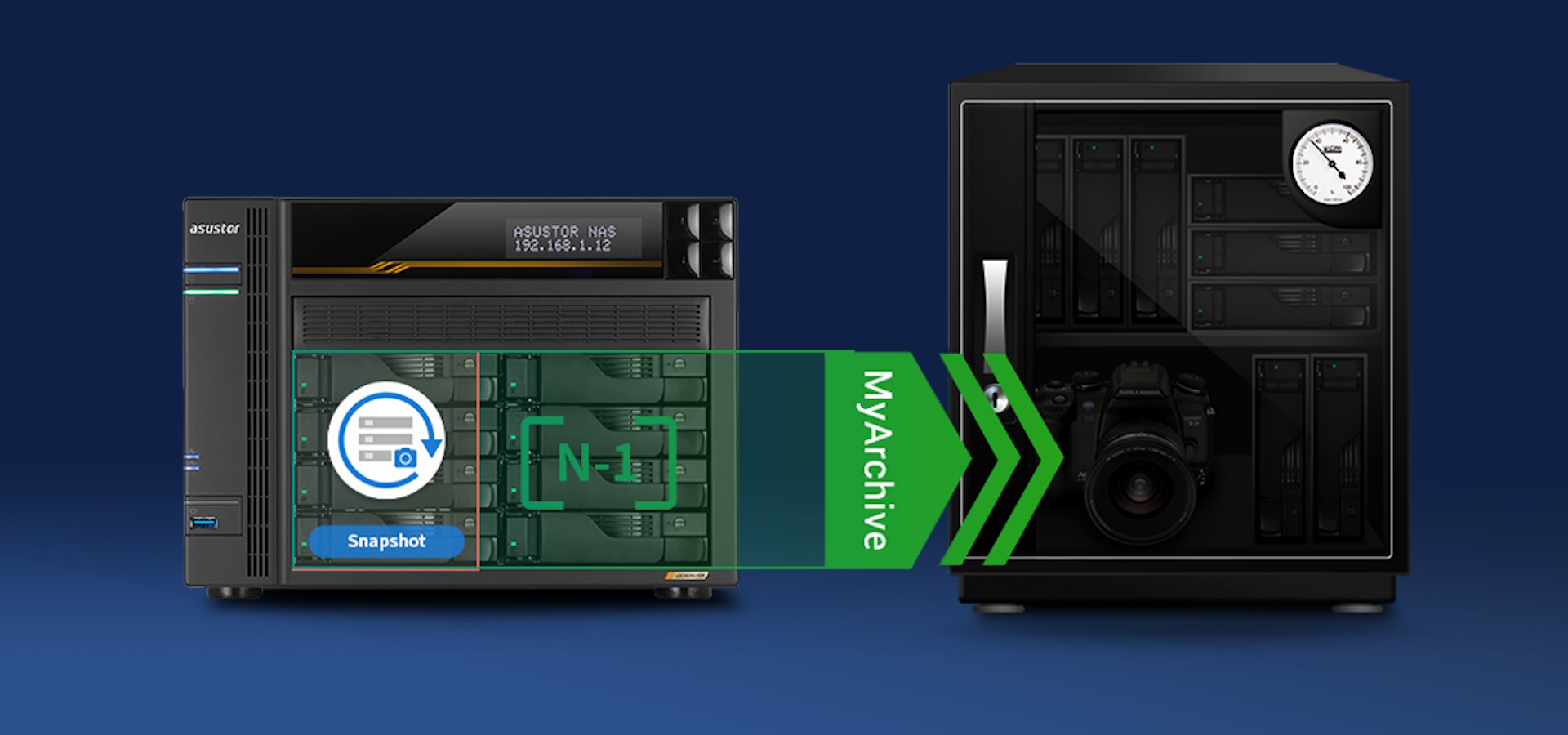 ASUSTOR NASでは、ハードディスクを取り外し、入れ替えすることができる「MyArchive」機能が便利です。例えば、容量が少なくなってきたハードディスクを取り外して、新しいハードディスクに入れ替えることができますし、また用途やプロジェクトに応じて複数のハードディスクを使い分けることができます。