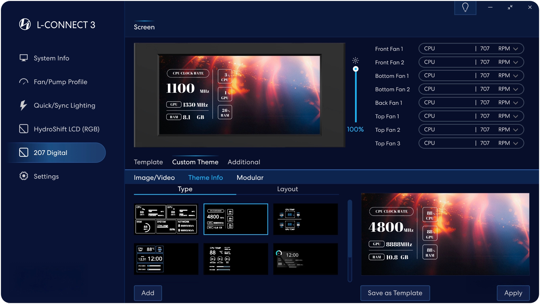 ファンの速度やLEDライティングなどのシステムを管理・制御する専用ソフト「L-Connect 3」にて、ディスプレイを自分好みにカスタマイズできます。モジュール要素を組み合わせて、画面内に配置。また、お気に入りの画像をアップロードしてして、あなただけの特別なディスプレイを実現できます。
