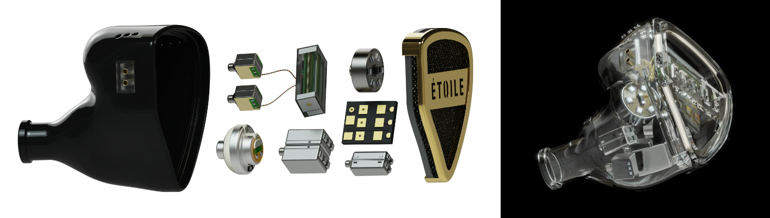 ETOILEは、特注の10ドライバーによる5way/6クロスオーバーのクアッドブリッド構成を採用。低域を支える独自の10mmダイナミックドライバー「M10」、2つのデュアルドライバーモジュールに配置された4基のSonion製BAドライバー、高域用の4基のSonion製静電ドライバー、そして高域と超高域の精度をさらに上げるため独自の8mm静磁(静電磁気)ドライバー「M8」を搭載しています。