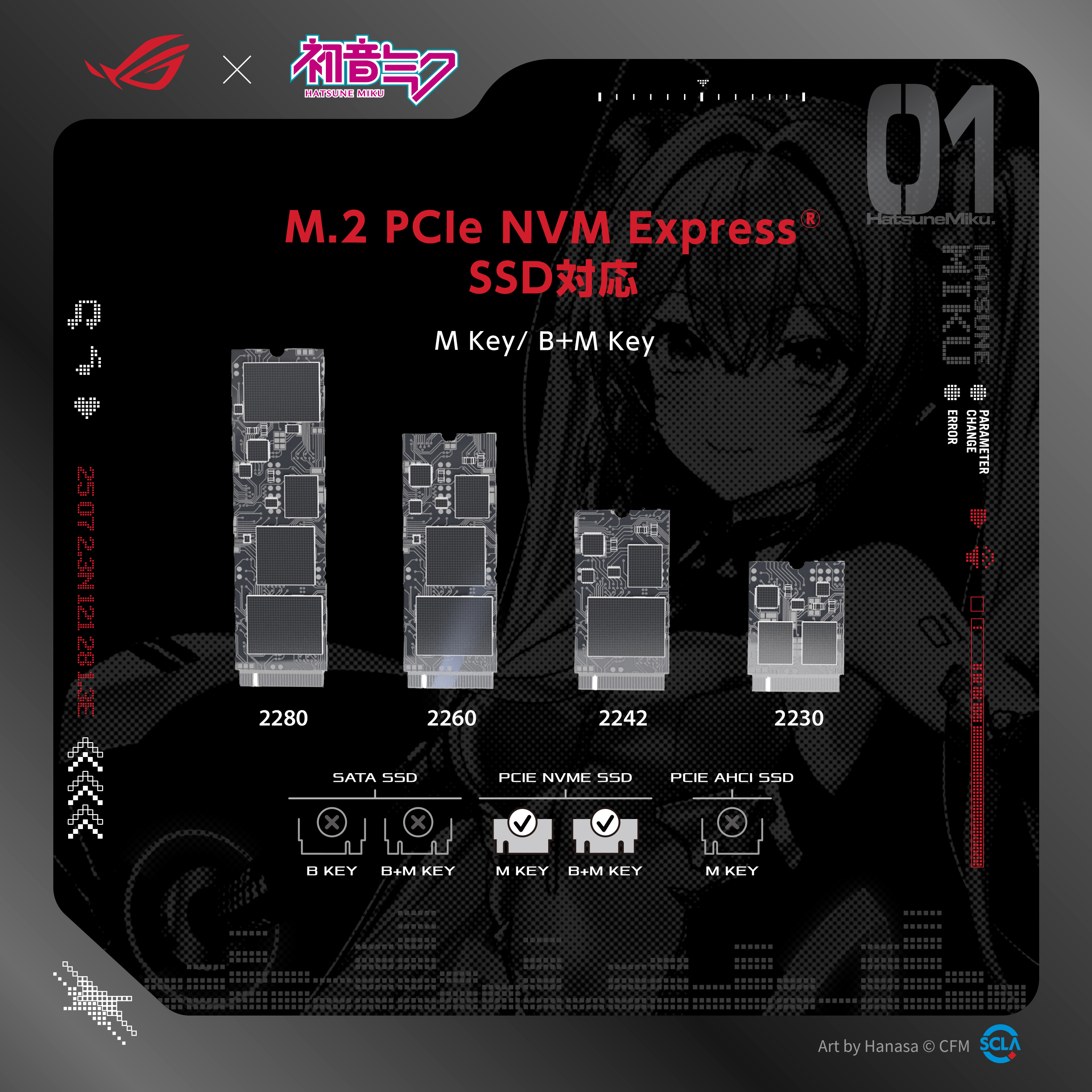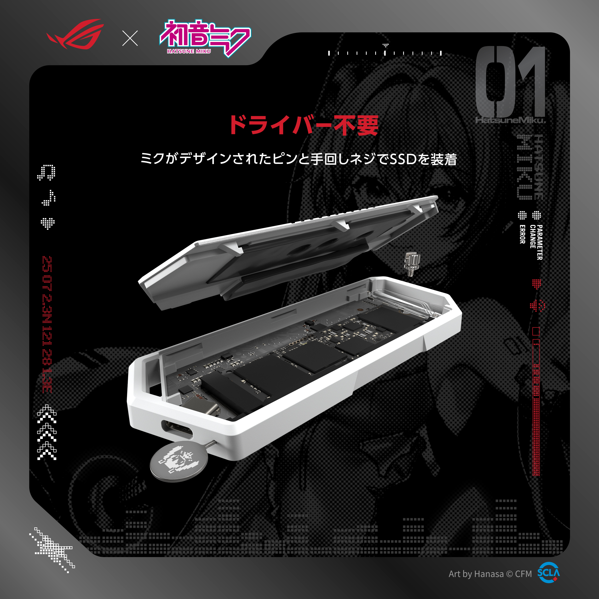 ブルーグリーン、ホワイト、ピンクのカラーでミクのデジタルな個性とROGのゲーム性を融合しました。片面には回路モチーフや「01」ID、波形バー、もう一方にはミクのシルエットラインアートをデザインし、ROG&初音ミク両ブランドのロゴ入りストラップとクロームRフック付きです。サイバーパンクな美しさが際立ちます。2230/2242/2260/2280 M.2 PCIe NVMe SSDに対応し、工具不要で簡単にセットアップ可能でアルミ合金筐体&サーマルパッドで高い放熱性も実現します。