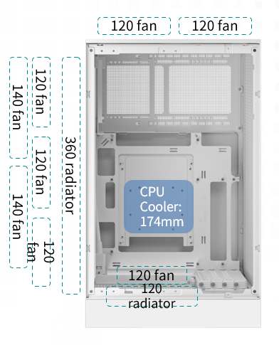 複数のメッシュパネルを備え、高エアフローを実現しています。360mmラジエーター対応、最大174mmの空冷CPUクーラー対応、最大6基の120mmケースファン搭載可能で、用途に応じた柔軟な冷却設計が可能です。※画像はイメージです。