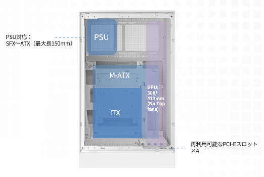 最長388mmまでの大型GPUをサポート(ケーストップ部にファン非搭載時は最長413mm)。また、最長150mmまでのATX電源ユニットを搭載可能で、幅広い構成に対応します。※画像はイメージです。