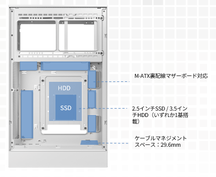 29.6mmのケーブル配線スペースを備え、背面コネクタマザーボード(MicroATXサイズ)に対応します。