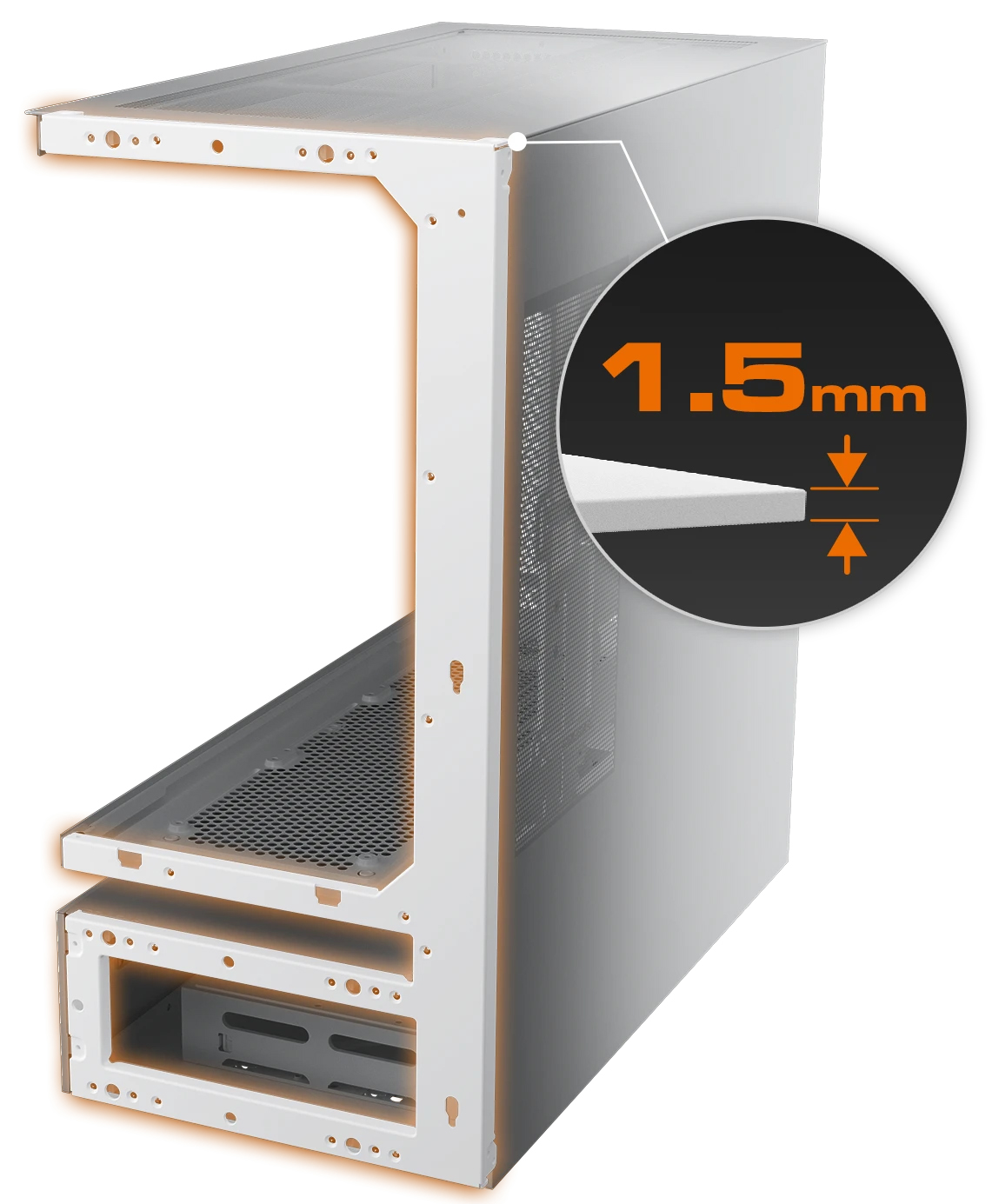 シャーシの素材に1.5mm厚のスチールフレームを採用することで、メインチャンバーが宙に浮いているかのような独創的なレイアウトでも、高い安定性を維持する堅牢な設計となっています。歪みやたわみを気にすることなく、全体の重量が重くなるようなハイパフォーマンスのスペック構成でも安心して使用することができます。