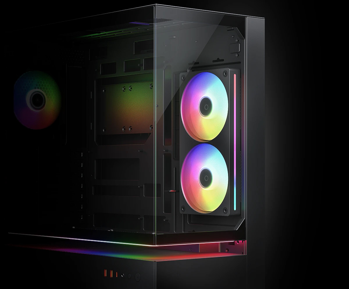 マザーボード横には、一体成型ファン「UNITY 240 ARGB REVERSE BLADE」を標準搭載。リアには120mm ARGB PWMを1基標準搭載しており、上部エリア底面に設けられたLEDストリップとともにケースを美しく彩ります。