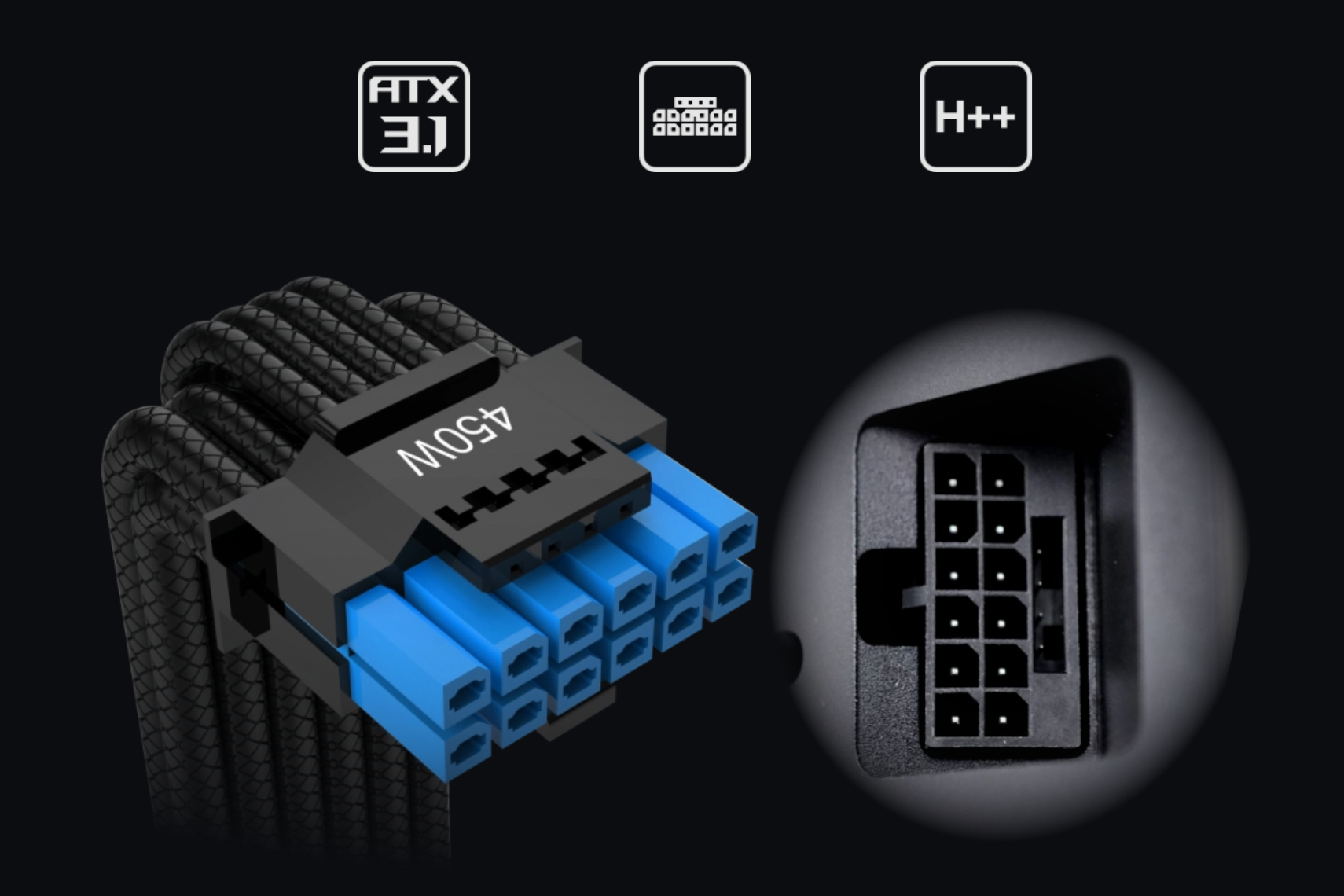 650W/750Wモデルでは、最新の ATX 3.1 仕様に準拠した次世代 12V-2×6 電源コネクタを備えており、PCIe 5.1 グラフィック カードを直接サポートし、現代のシステムの増大する電力需要に対応します。※12V-2×6コネクタは、両側に2色のハウジングデザインを採用しています。確実に接続するために、青い部分が完全に差し込まれていることを確認してください。