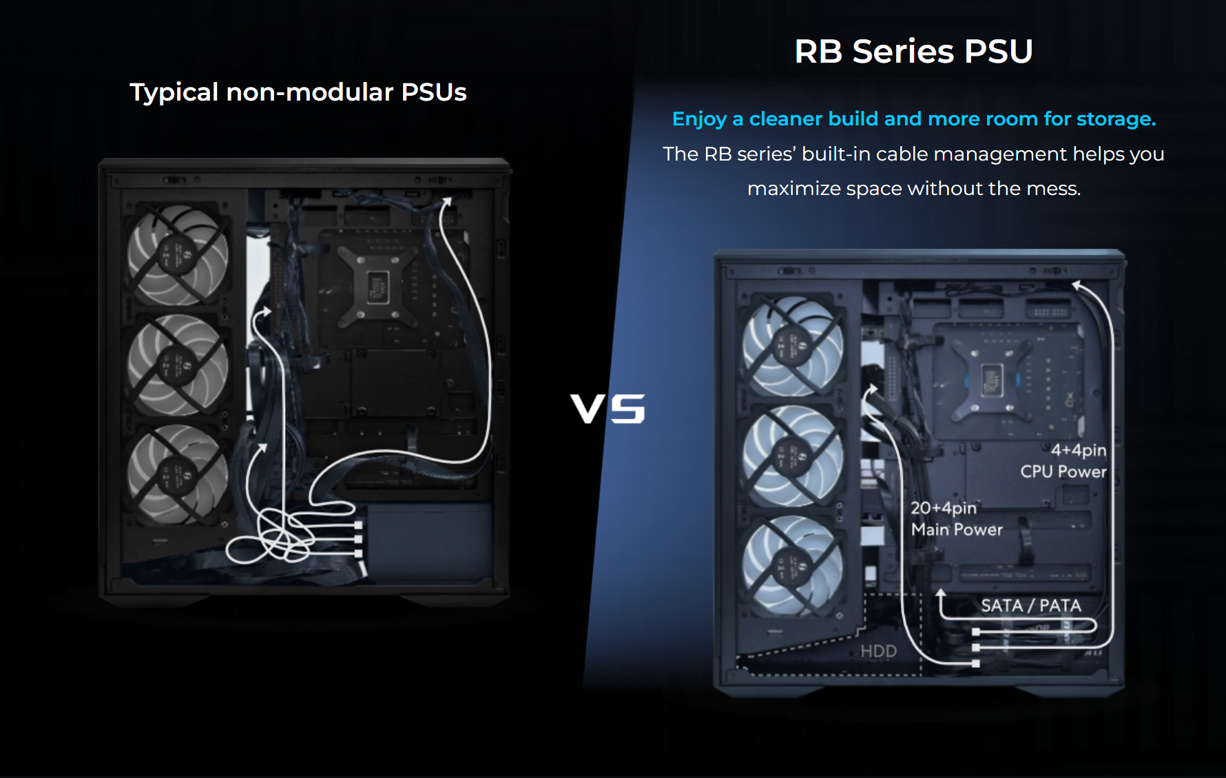 これによりエアフローが向上し、乱雑さが軽減され、よりクリーンでプロフェッショナルなビルドを実現します。
