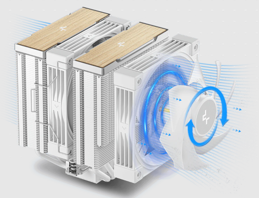 精密加工された銅製ベースと6本の銅製ヒートパイプ、冷却フィンを高密度に配置したマトリックスデザインのデュアルタワー型ヒートシンクを組み合わせ、高い冷却性能を発揮します。トップカバーには精巧に仕上げられた木目調デザインを採用し、クーラーと一体化した美しいビジュアルを実現しています。