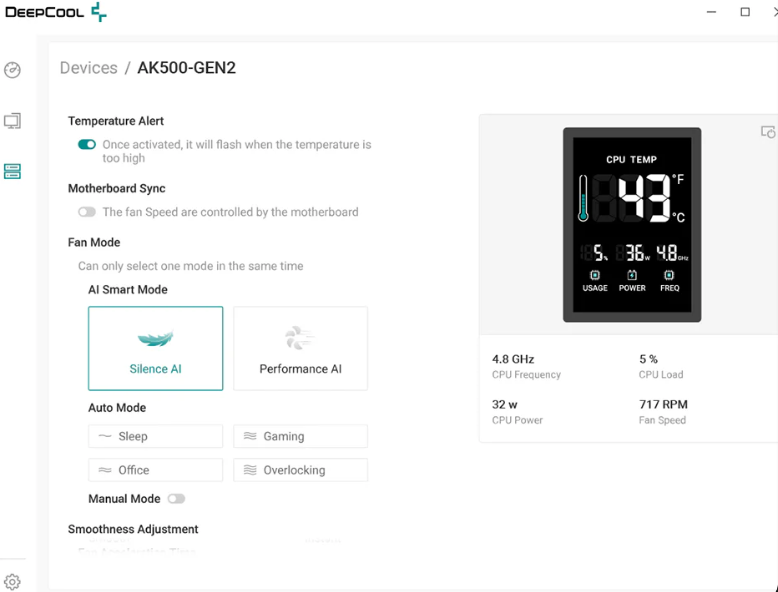 DeepCreativeの独自のAIアルゴリズムがCPUの負荷をリアルタイムで追跡し、最適なファン速度を自動的に調整します。負荷に応じて静音性とパフォーマンスを自動的に調整するAIスマートモード、 状況に応じたプリセットモード(スリープ・オフィス・ゲーミング・オーバークロック)をシームレスに切り替え可能です。これらの設定は「DeepCreative」上から行うことができます。