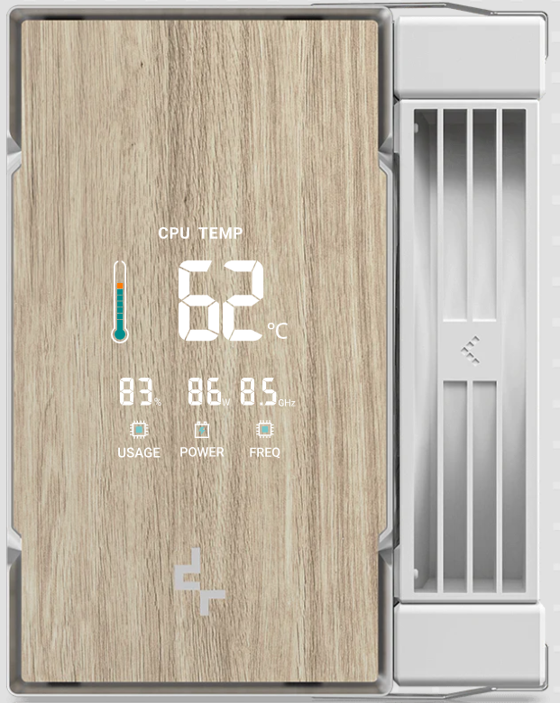 4つのセグメント(CPU温度、使用状況、消費電力、周波数)をモニタリング可能なLCDを天面に搭載。USB 2.0ヘッダーに接続することで専用ソフト「DeepCreative」により制御可能です。CPU温度に応じて、左側のインジケーターが段階的に色を変化させる警告機能も備えています。