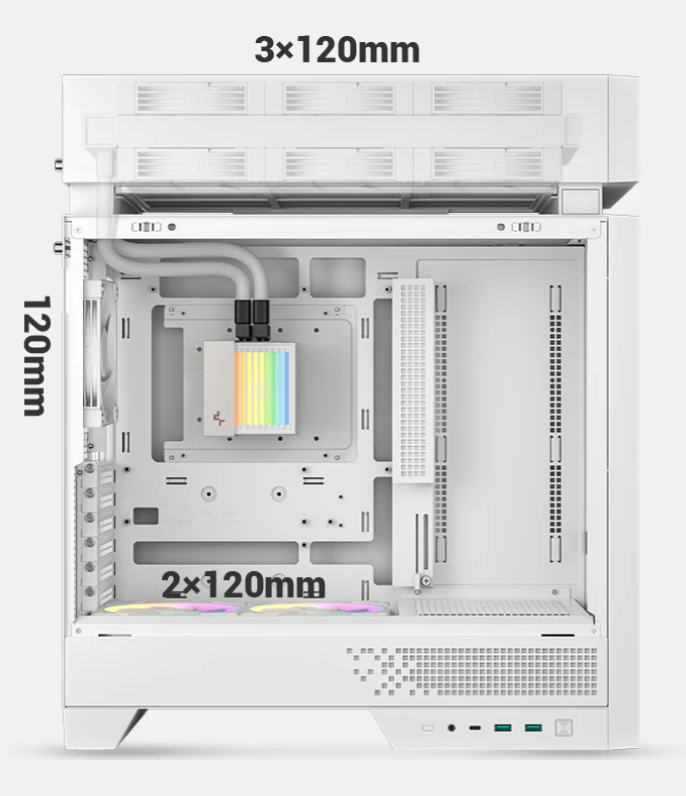 CPU・GPU・PSUの主要熱源ごとにゾーンを独立する形で分離し、エアフローを分断することで、従来レイアウトでは避けられなかった熱の滞留や干渉を防ぎ、ケース全体の冷却性能を飛躍的に高め、内部レイアウトも整理された美しい状態を維持します。ケーストップ部にラジエーター専用の分離したトップチャンバーを設置し、水冷クーラー専用の吸気・排熱スペースを確保することで、ケース全体の冷却性能を飛躍的に高め、内部レイアウトも整理された美しい状態を維持します。