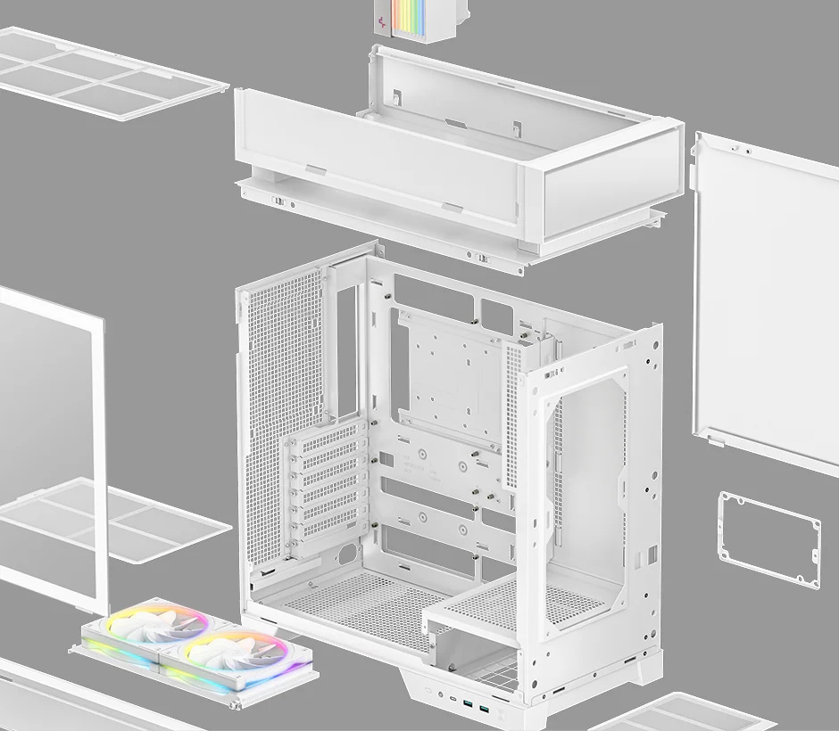 各パネルは工具不要で着脱可能で、組み立てやアップグレードをスムーズに行えます。ボトムファンブラケットは完全に取り外し可能で、ファンのメンテナンスを容易に行えます。