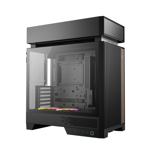 ケーストップ部にラジエーター専用の分離したトップチャンバーを設置し、水冷クーラー専用の吸気・排熱スペースを確保することで、ケース全体の冷却性能を飛躍的に高め、内部レイアウトも整理された美しい状態を維持します。ケースボトムにはGPUの冷却用に120mm ARGBリバースブレードファン「FL12R SE」を2基標準搭載。さらに、GPUとPSUにも独立したエアフローを確保し、優れた冷却性能とクリーンな内部レイアウトを実現しています。