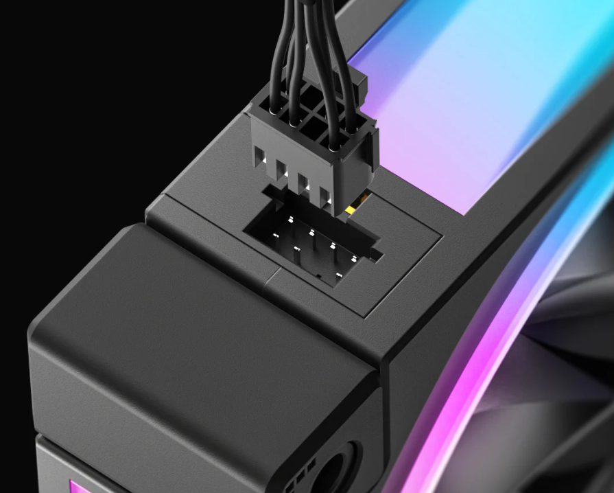 PWM制御とARGB同期を統合した8ピンコネクターを採用し、取り付けが簡単で安全性も向上しています。さらに、四隅に設置された全面ゴムパッドが、ファンの振動を最小限に抑え、不均一な取り付け圧による騒音を軽減します。