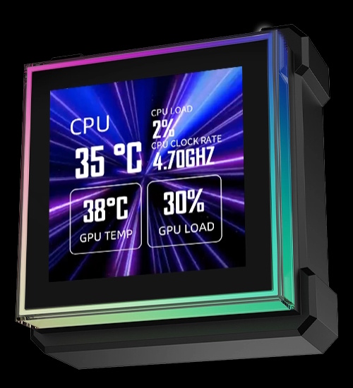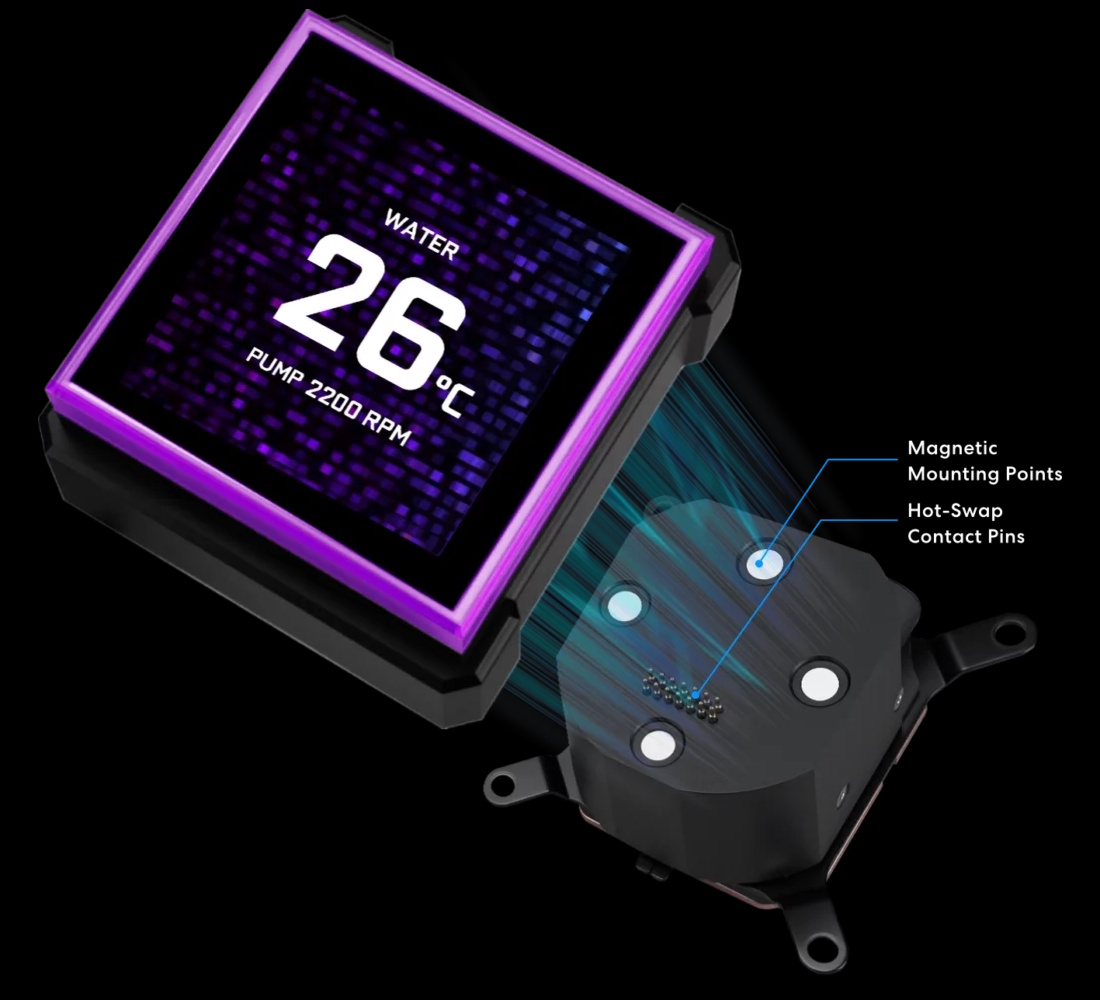 解像度:480×480、輝度:500nit、リフレッシュレート:60Hzの3.4インチIPSディスプレイを水冷ブロックに搭載。水冷ブロックにはマグネット式のコネクタを採用し、電源を切ることなくディスプレイを固定できる仕様のため、システム組み立て後の取り付けも簡単です。