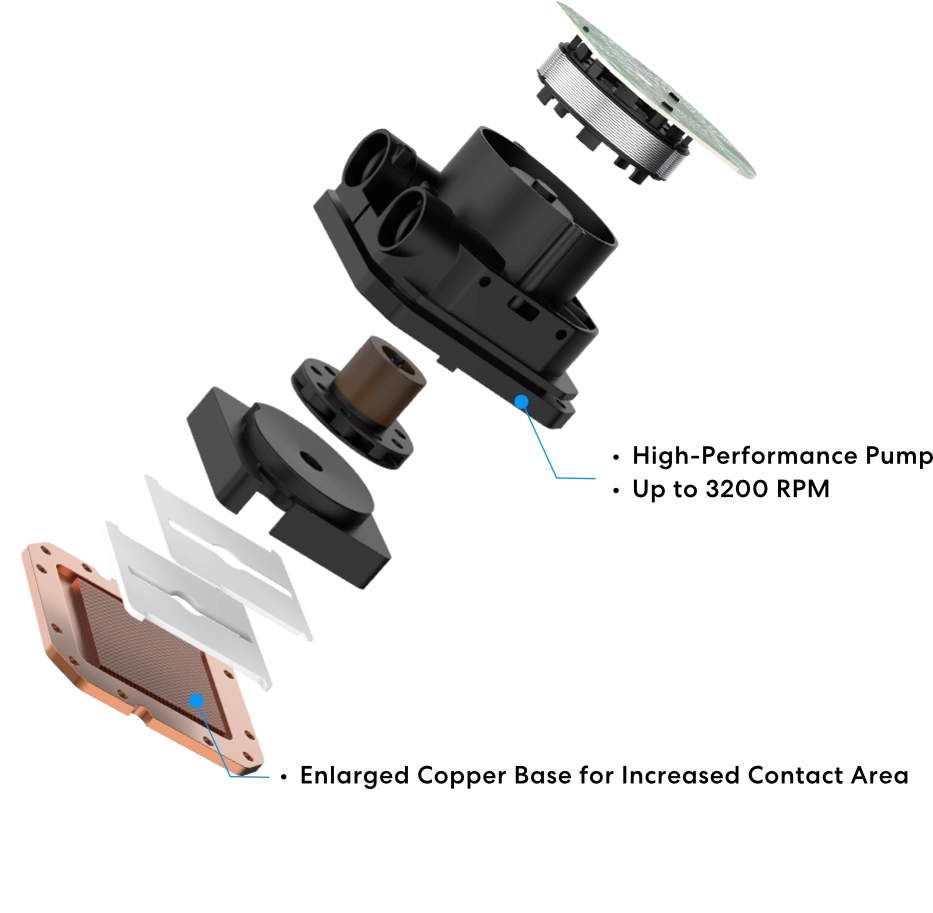 最大3200RPMのパフォーマンスを発揮するポンプを内蔵しており、冷却性能の強化を図っています。