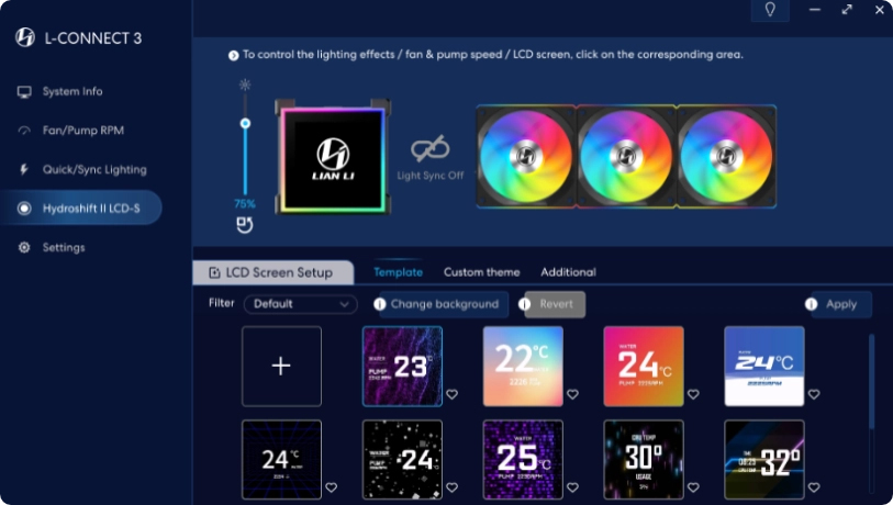 USB経由で接続すると、L-Connect 3を通じての制御が可能になります。画面のテーマを簡単に切り替えたり、カスタム画像をアップロードしたり、パーソナライズされたレイアウトを設計したりして、ディスプレイを機能と視覚的な魅力の両方を高める動的なセカンダリスクリーンに変えることができます。
