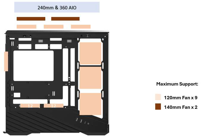 「Vector V100 MINI」「Vector V100R MINI」は、120mmファンを最大9基、360mmの水冷クーラーを搭載可能です。対応ケースファン