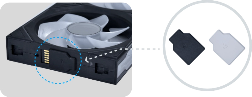 スライドインデイジーチェーン機構により、簡単にデイジーチェーン接続が実現します。ファンの側面を組み合わせ、スライドさせ固定する、ツール不要のジョイント設計です。