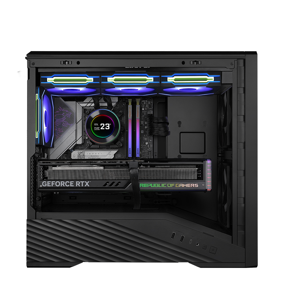 フロントには、奥行きのある空間を生み出すインフィニティミラーデザインを採用。内部を幾重にも縁取るARGBライティングと、標準搭載の140mm ARGBファン2基がフロントを鮮やかに彩ります。